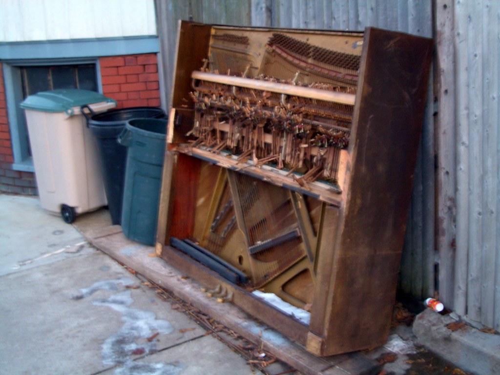 Desensitized to all the brightdangle and claptrap for purchase in the stores these days, I am mesmorized by the things people throw out and can throw out; this piano carcass being no exception.
