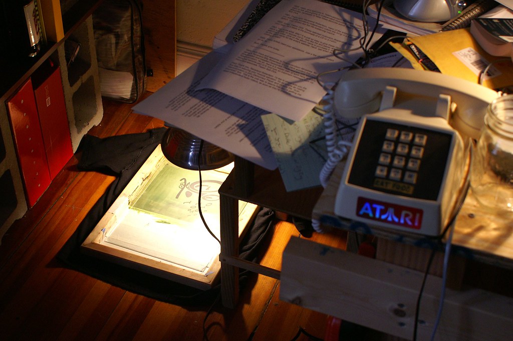 Get the (now) dried emulsion convered screen. It is photosensitive—not sensitive like photographic paper, but just don’t point a spotlight at it.