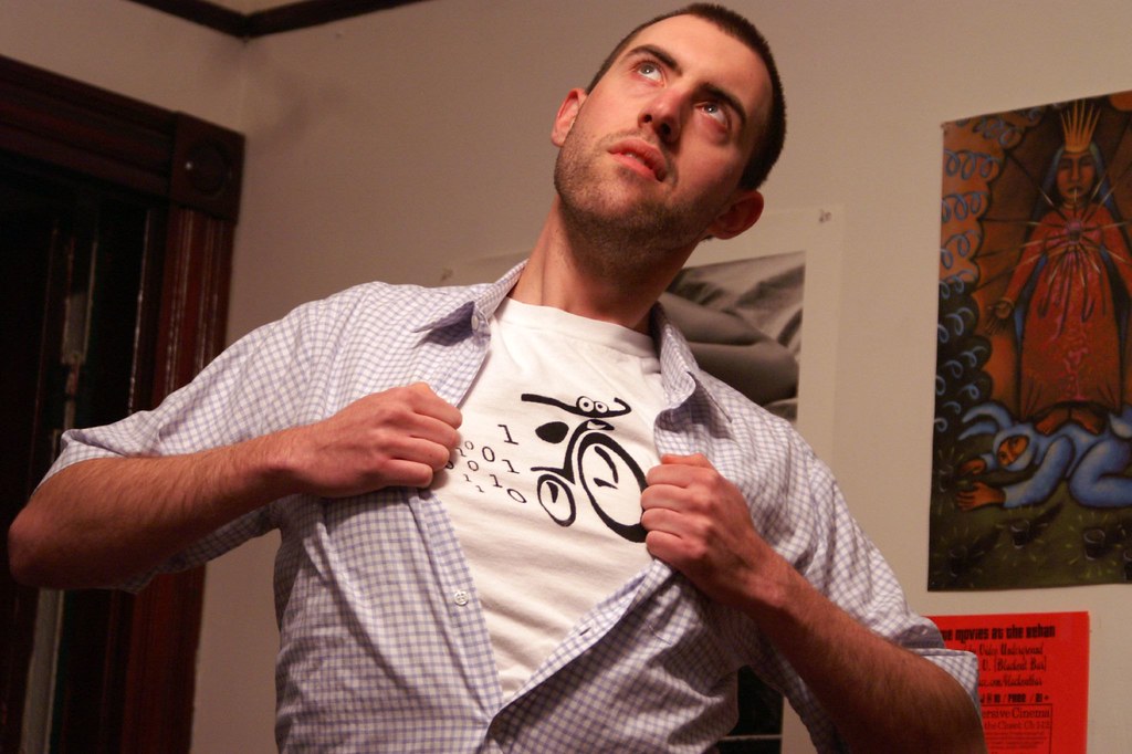 I was over at my pal Dean’s place in Jamaica Plain today. In addition to lots of semi-expired foodstuffs he snags from behind the Co-Op next door, he also has the screens and materials for t-shirt printing. Previously I had been helping him up in Lowell filming some promos for his Democracy Player channel, “Telemusicvision”:http://telemusicvision.com; today we were putting stuff on t-shirts.